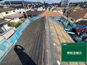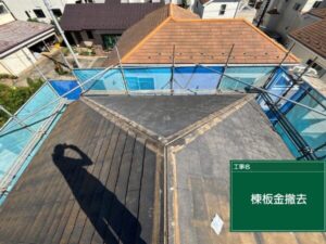 新しい屋根材を設置するには、棟板金のふくらみが邪魔となるので、こちらを撤去していきます。