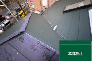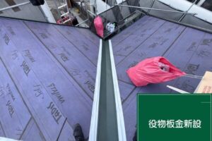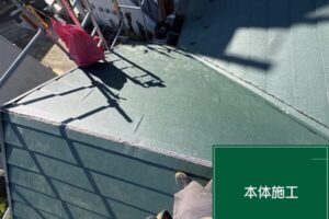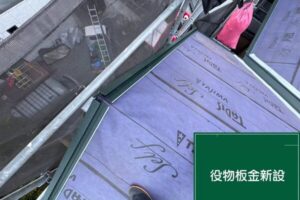 屋根材は「スーパーガルテクト」を使用し、既存屋根の上から新しい屋根材を設置する「カバー工法」を行っています。