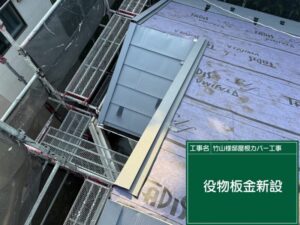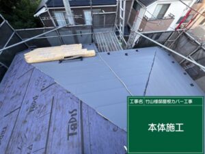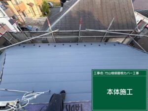既存の屋根を取り外すことなく、新しく防水シートと屋根材を設置するカバー工法で施工いたしました。