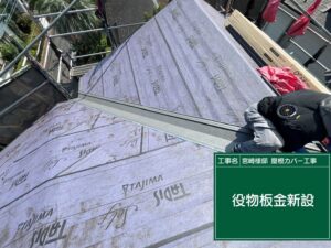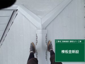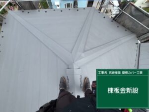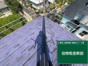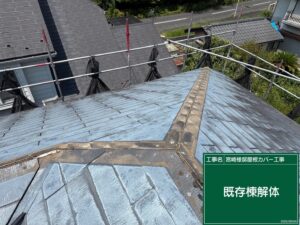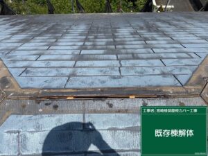 「カバー工法」は既存屋根は取り外さず、そのままに残したうえで、新しい防水シートと屋根材を設置する屋根修理ですが、棟板金と貫板があると納まりがよくないので、これらを取り外し平坦な状態を作ります。