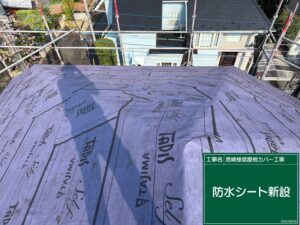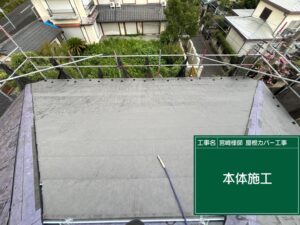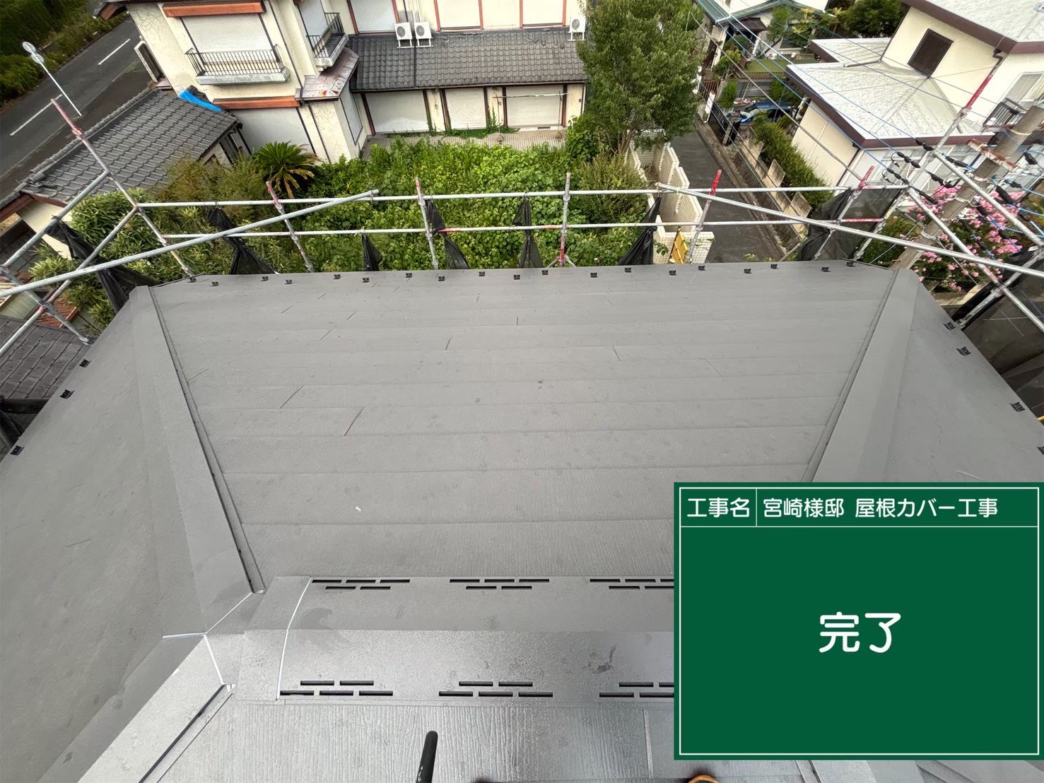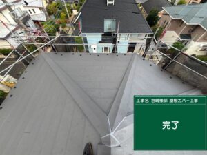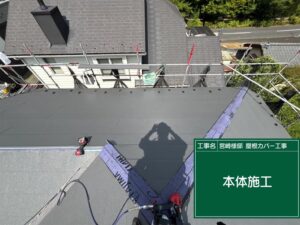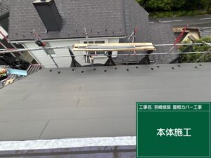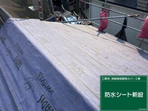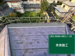 お客様のご要望で、既存屋根から新しい防水シートと屋根材を設置する「カバー工法」をさせていただきました。