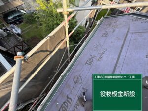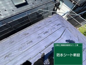「カバー工法」での屋根修理ですので、古い屋根材はこのままで新しく防水シートと屋根材を新設します。