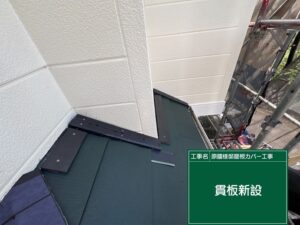 防水シートの上から、屋根の端や、屋根の面と面の境目に役物板金を設置します。