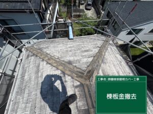 設置面を平坦にするために、頂上部分にある棟板金を撤去します。